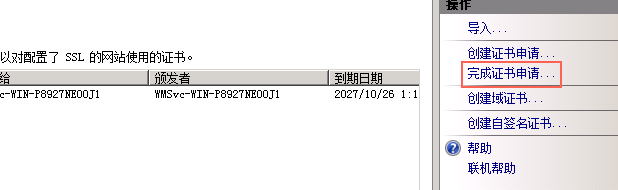 雙擊打開服務器證書后,點擊右則的完成證書申請