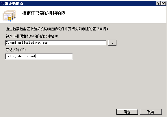 選擇 Verisign 頒發的服務器證書文件,并指定一個好記的名稱(可選),點擊確定